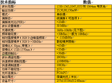 非常窄的光譜線寬(長相干距離)線寬〈1 KHz中心波長1530-1565和1030-1080nm高達150mW的輸出功率,絕對單一縱模單偏振態(tài)輸出
